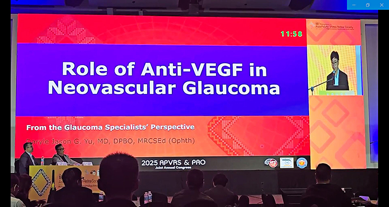 The session then turned to neovascular glaucoma, with Dr. Daryle Jason G. Yu (Philippines) describing the condition as a rapidly progressive disease driven by ischemic retinal pathology that ultimately leads to anterior segment damage.