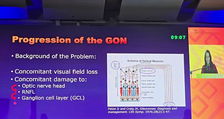 Dr. Maria De Guzman (Philippines) of Asian Hospital opened the session by addressing the challenge of identifying true glaucoma progression in eyes affected by retinal pathology. She explained that secondary glaucoma differs fundamentally from primary open-angle glaucoma, particularly in how intraocular pressure (IOP) elevations and associated damage evolve.